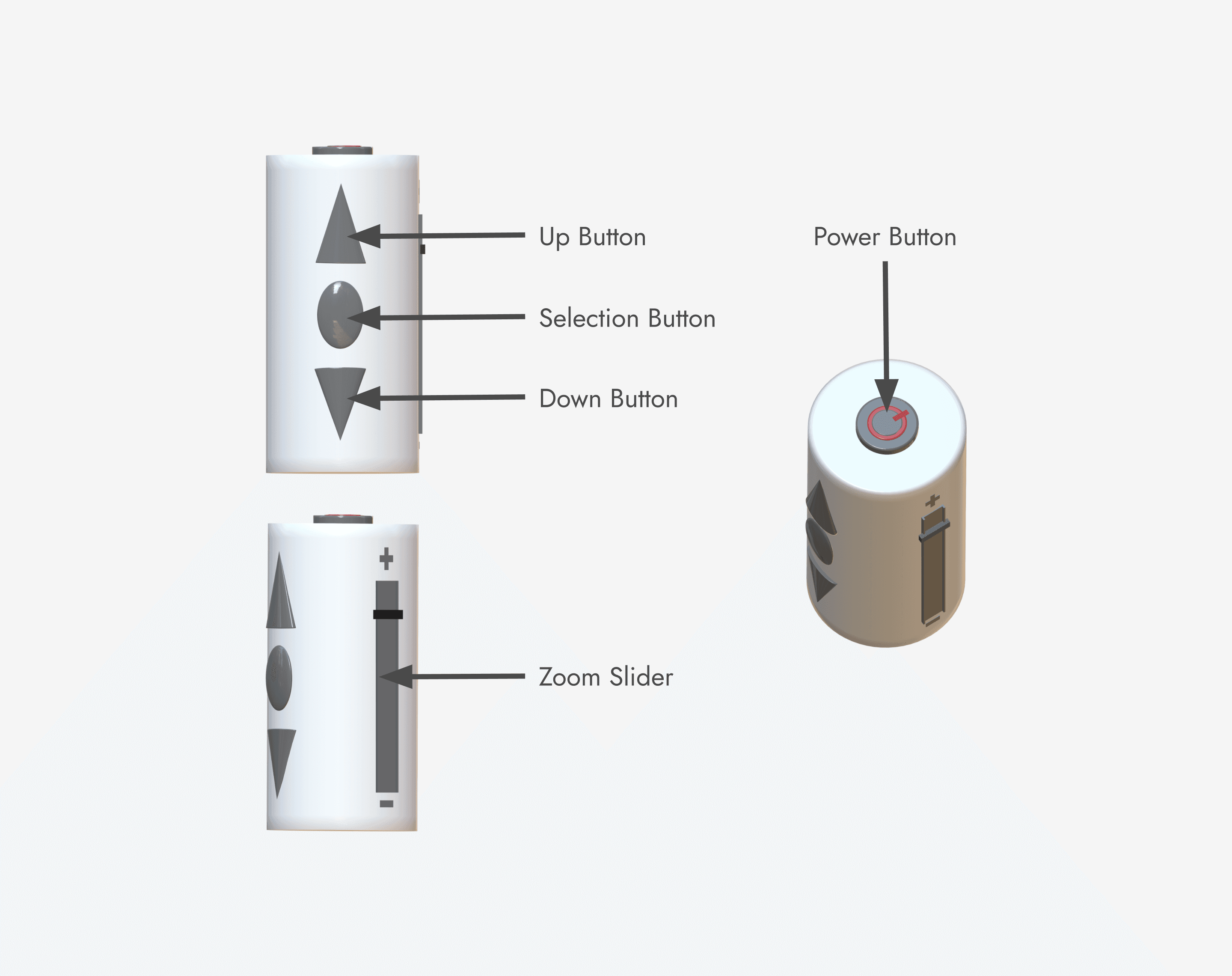 When detached, it functions independently with up/down navigation buttons, a central selection button, and a side zoom slider.